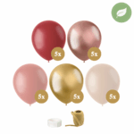 Luxe ballonnenset met 25 ballonnen in warme tinten: bordeauxrood, oudroze, rosé metallic en goud. Biologisch afbreekbaar latex, geschikt voor helium, inclusief eco bio krullint en lijmpuntjes voor een zwevend effect zonder helium.
