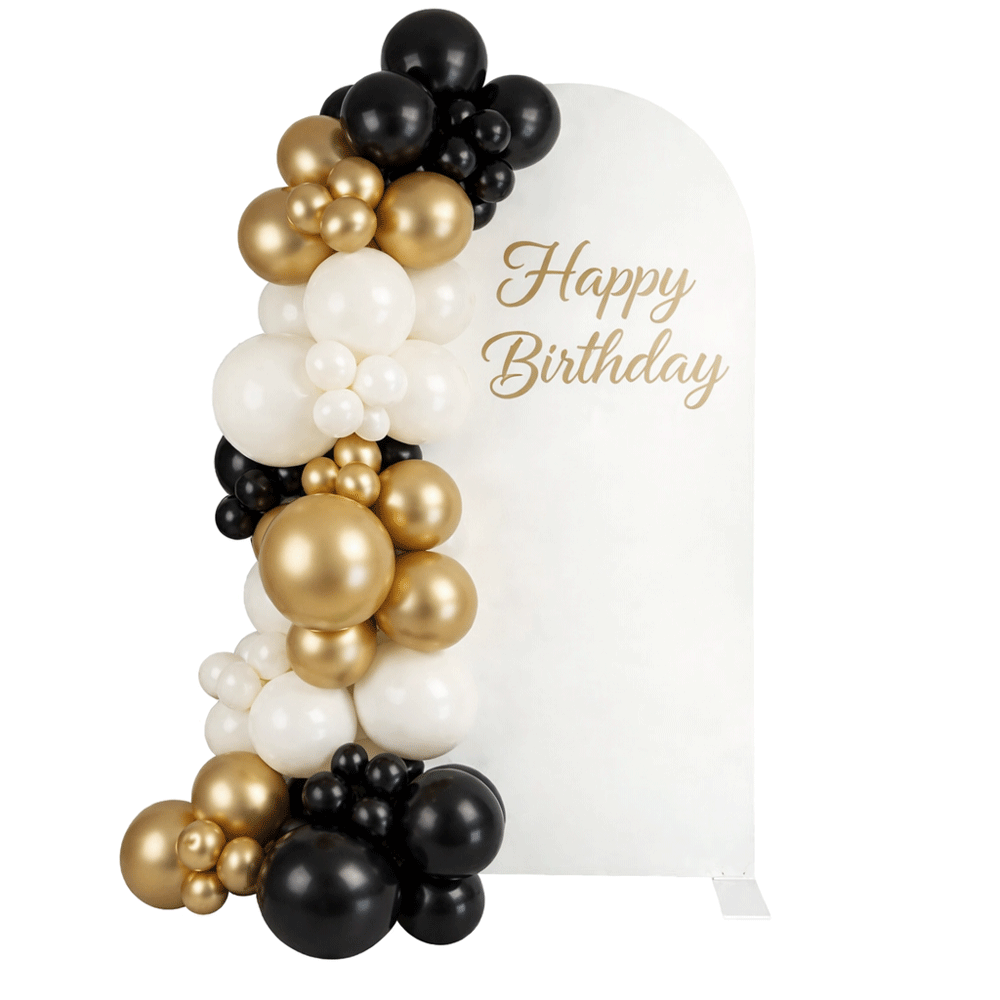Met deze ballonnenboog in zwart, goud en wit maak je in een handomdraai een indrukwekkende blikvanger voor elk feest. De set bevat 110 ballonnen in drie maten, waardoor je diepte en volume creëert in je boog of ballonwolkje.