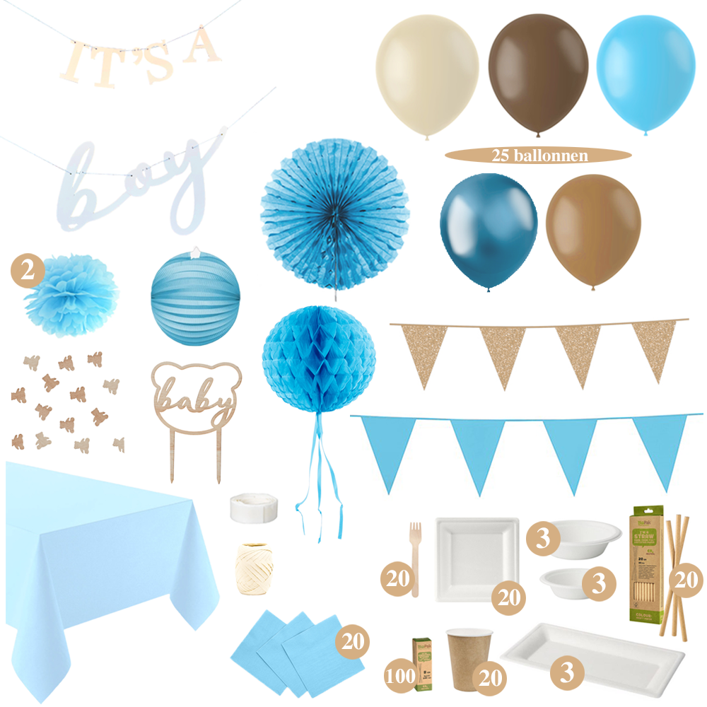 Geboorte Versiering Pakket met Tafel Decoratie – Jongen – Baby Blauw en Bruin