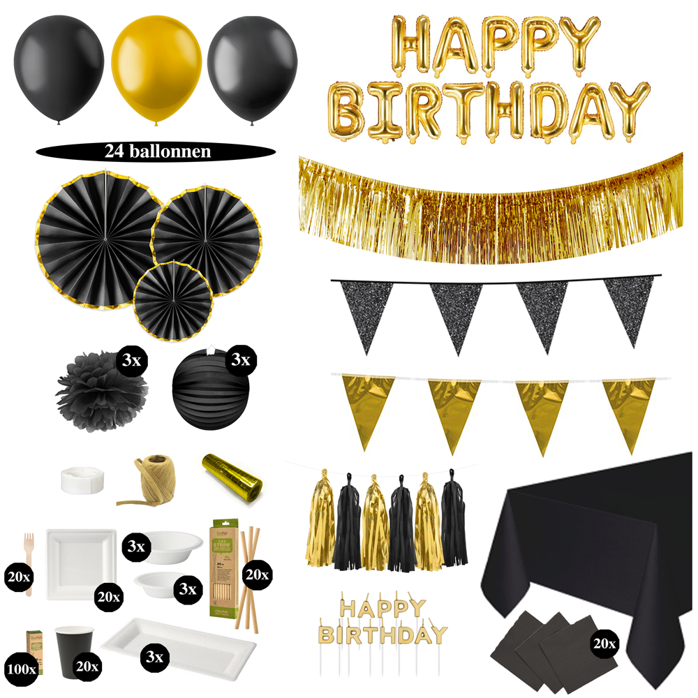 Vrolijke slingers, extravagante waaiers, en prachtige ballonnen. Wat wil je nog meer? Misschien de deluxe uitbreiding, waarmee je een chique tafel kunt dekken.